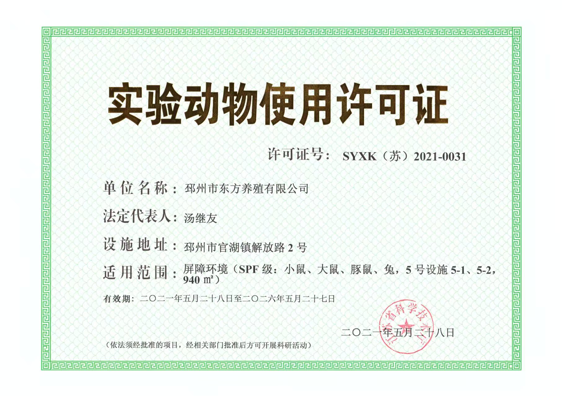 实验动物使用许可证